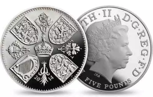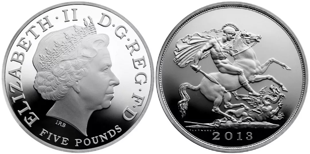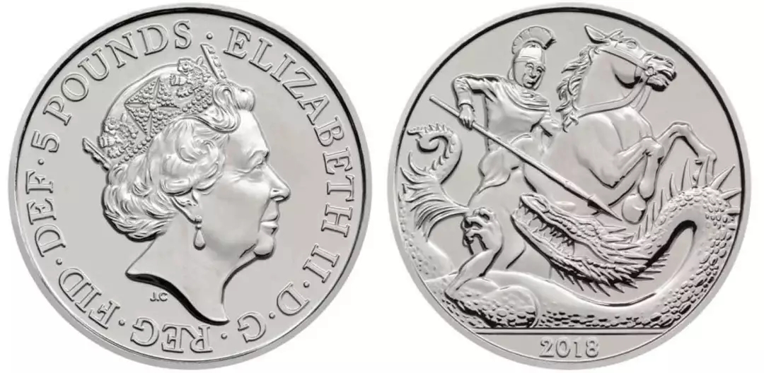 2013年,王室第三顺位继承人乔治王子诞生时,英国皇家造币厂铸造了纪念银币,正面为女王头像,背面为圣乔治屠龙题材。