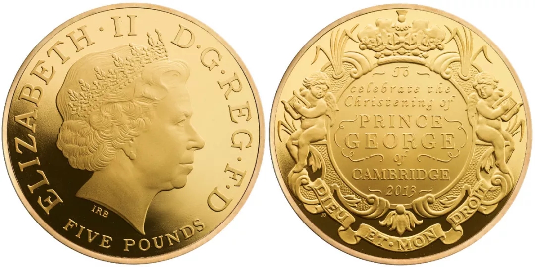 2013年,乔治王子出生后三个月,在伦敦圣詹姆斯宫的皇家教堂接受了基督教的洗礼。仪式由坎特伯雷大主教主持。为纪念乔治王子受洗,英国皇家造币厂推出了一系列纪念币,包括金的、银的、铂的、合金的……纪念币的图案采用与王室传统洗礼相关的百合花束,两旁各有一个弹奏竖琴的小天使。