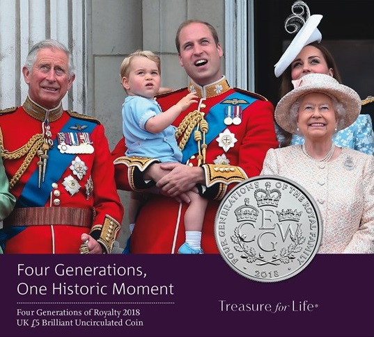 乔治小王子的出生,使100多年来英国王室首次出现君主和准君主“四世同堂”,所以造币厂还铸造了这一主题的纪念币。