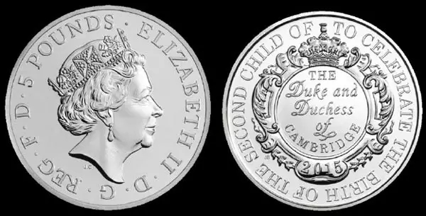 2015年,夏洛特小公主诞生,她是仅次于祖父查尔斯王子、父亲威廉王子和哥哥乔治王子的英国王位第四顺位继承人。英国皇家造币厂特铸造面额5英镑纪念币一枚。正面图案按惯例为女王伊丽莎白二世头像,背面有“庆祝剑桥公爵及夫人喜获次女”字样,衬以花饰镶板、小冠冕及百合花等。
