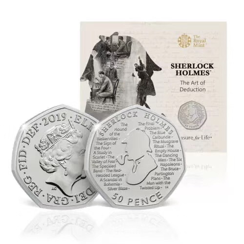 为庆祝著名侦探小说家亚瑟·柯南·道尔爵士(Sir Arthur Conan Doyle,1859-1930)诞辰160年,英国发行了一组以他创作的重要人物形象“夏洛克·福尔摩斯(Sherlock Holmes)”为主题的纪念币,包括金的、银的、铜镍合金的,丰俭由人……