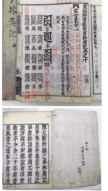 《事林广记》是在鹤本书店购得的,为元禄十二年(1699)京都今井七郎兵卫、中野五郎左卫门刊本,其所据底本为元泰定二年(1325)刊本。泰定本保留了《事林广记》早期版本系统的面貌,在中国久已亡佚,因此元禄本是很重要的版本。在鹤本书店所见的元禄本《事林广记》内页有着“共十本。壬寅正月念四,炳卿”的题识。内藤湖南字炳卿,壬寅年即1902年。书中又用相同的字迹书写批注,提及以明洪武本校录八思巴文,“此书有洪武壬申仲春梅溪书院重刊本,编次体裁,已多异同,盖《至元译语》删去不存,今对校如下”云云,可知这部《事林广记》原是内藤湖南的旧藏。能有缘购得,真是非常高兴。