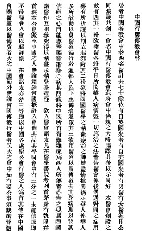 MMAC创会元老迫于时代环境,虽在官方名称中尚未强调改革关键,汉译时基本保留“在华医务传道会”的文字框架,用“中国行医传教会”以示区别(图三)。但事实上,旅华执业医生经历后续20余年的努力,最终断然将医学与宗教的前世姻缘割裂。