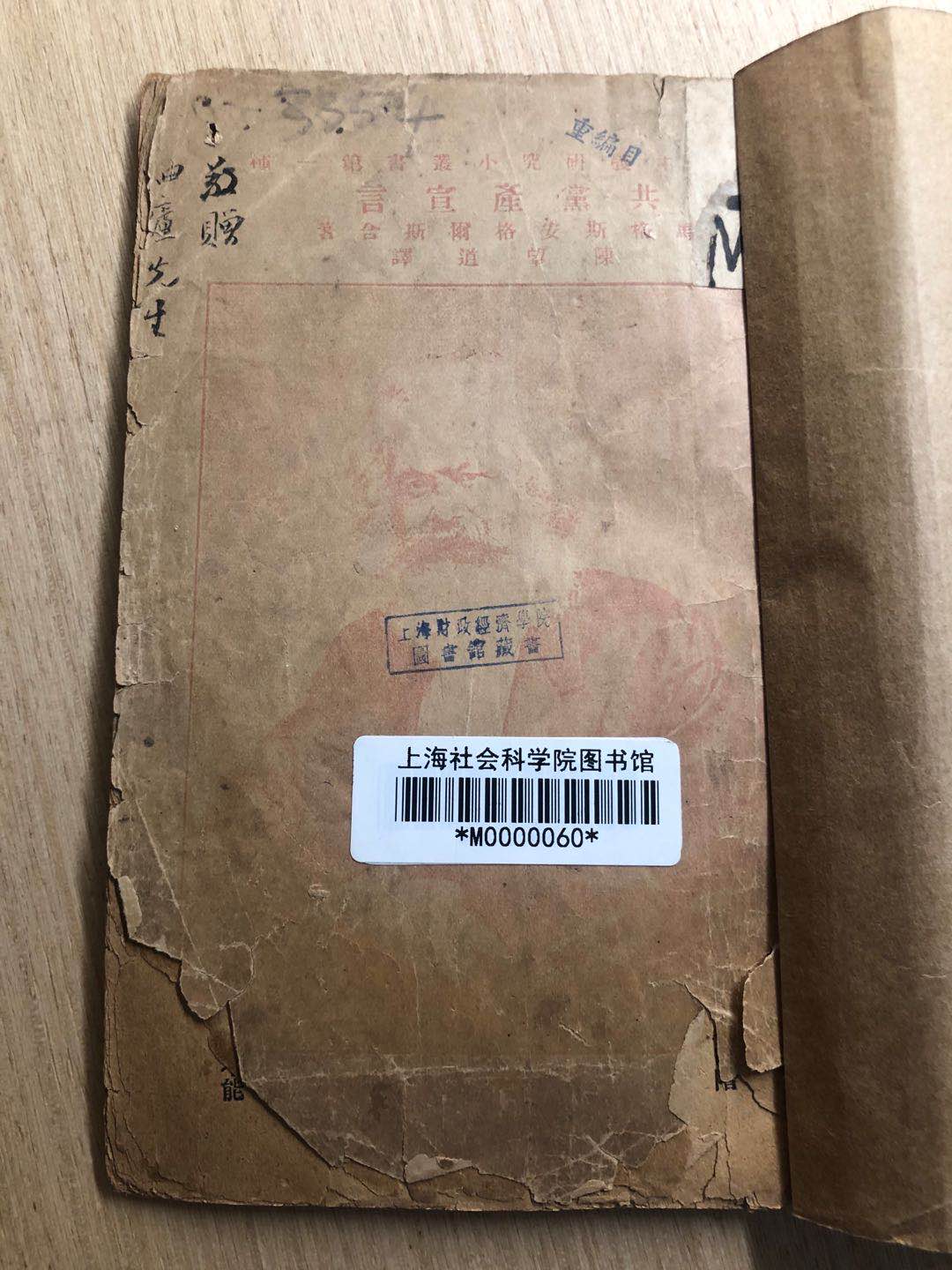 此次发现的藏本,封面左上角写有“敬赠岫庐先生”,中间有“上海财政经济学院图书馆藏书”印章,扉页落有“岫庐藏书”印。据上海社科院图书馆馆长钱运春介绍,这一藏本应为出版家、商务印书馆原总经理王云五旧藏,推测在1950年代院系调整时进入上海社科院图书馆馆藏,由于封面下缘残损,该藏本被覆了一层牛皮纸加以保护,“此次为了‘四史’学习教育活动,图书馆整理了一系列马克思主义思想在中国传播的出版物,在这一过程中发现这一藏本,是偶然也是必然”。
