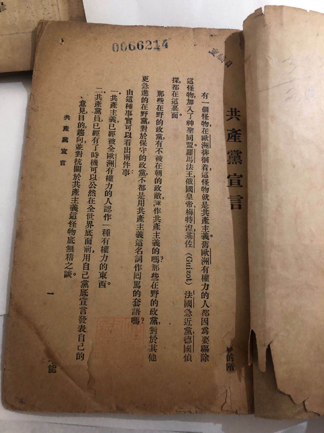 100年前,由陈望道翻译的首个中文全译本《共产党宣言》问世,经过百年更迭,现在已知存世的首版中译本仅有11本。近日,为配合“四史”学习教育活动,上海社科院筹备启用“党的诞生地”资料中心,布展过程中,工作人员在社科院图书馆馆藏中又发现了一册首版藏本。