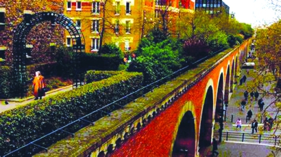 在这个意义上,我更喜欢巴黎的绿荫步道(La Promenade Plantée),而不是纽约的高线公园。巴黎绿荫步道是世界上第一个废弃高架铁路轨道的改造项目,也是纽约高线公园的灵感来源,它的城市公共空间品质丝毫不逊于纽约高线公园,知名度却远不及它的后继者们,这不能不说是一件非常幸运的事情。绿荫步道位于巴黎市12区,全长4.5公里,是始建于1858年的巴黎-文森铁路线的一段,1969年12月15日被弃用。1986年,巴黎市政府从法铁买下这段废弃铁路后开始规划设计和施工,1994年全线完工开放。全长1.4公里的艺术高架桥是整个绿荫步道的第一段,也是最知名的部分。拱券式的高架桥有71个拱,改造者清除了桥洞中原有杂乱建设的部分,把桥洞变成了一个个店铺,而桥顶则是种植了大量海棠、连翘、樱花的公园。艺术高架桥的改造,同时消解了原来的街区隔离氛围,桥的北面是由传统手工业区衰落而成的平民街区,南面则是靠近里昂火车站和河岸的新兴中产阶级社区。现在拱券中的每一个店铺都成了传统手工艺展示的橱窗,边界的跨越与消融,延续了街区的传统和多样性,同时又创造了新的透明性,而融入铁道元素的景观与自然的野趣,更适宜于居民和游人散步休憩,电影《爱在日落黄昏时》也曾在此取景。