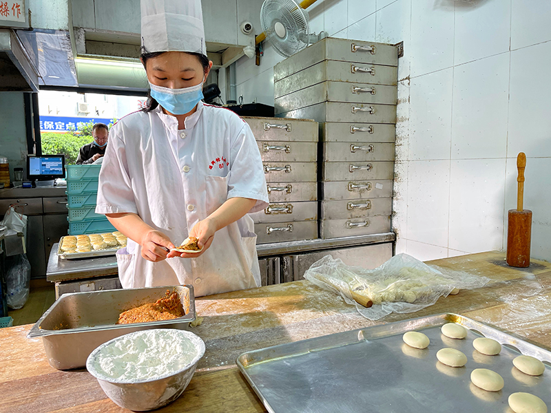 德兴菜馆龙云店的厨师长王翔告诉记者,青花椒腊味月饼和榴莲酥月饼是他们首次推出的新口味,一咸一甜,满足不同顾客的喜好。“以前我们只供应传统鲜肉月饼,但是考虑到现在来光顾的年轻顾客越来越多,所以作为老字号我们也要与时俱进,追赶潮流,在坚守传统工艺的同时尝试口味上的突破。”