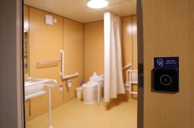 20间无障碍卫生间进行了同步改造。这里明亮宽敞,全部采用电动门,具备语音提示,洗漱台的镜子采用了倾斜角度设计,方便轮椅使用者。