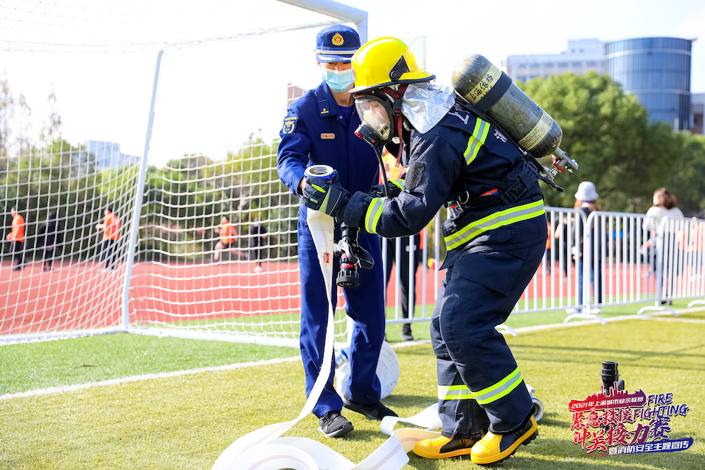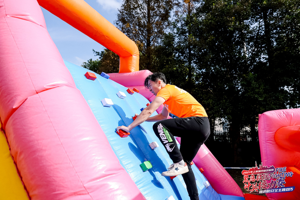 2021年上海城市业余联赛——紧急救援消防冲关接力赛暨消防安全主题宣传活动20日上午在华东师大张江实验中学举行,本次活动吸引来自全市的25支队伍和100位个人体验选手,共计约200人积极参与。