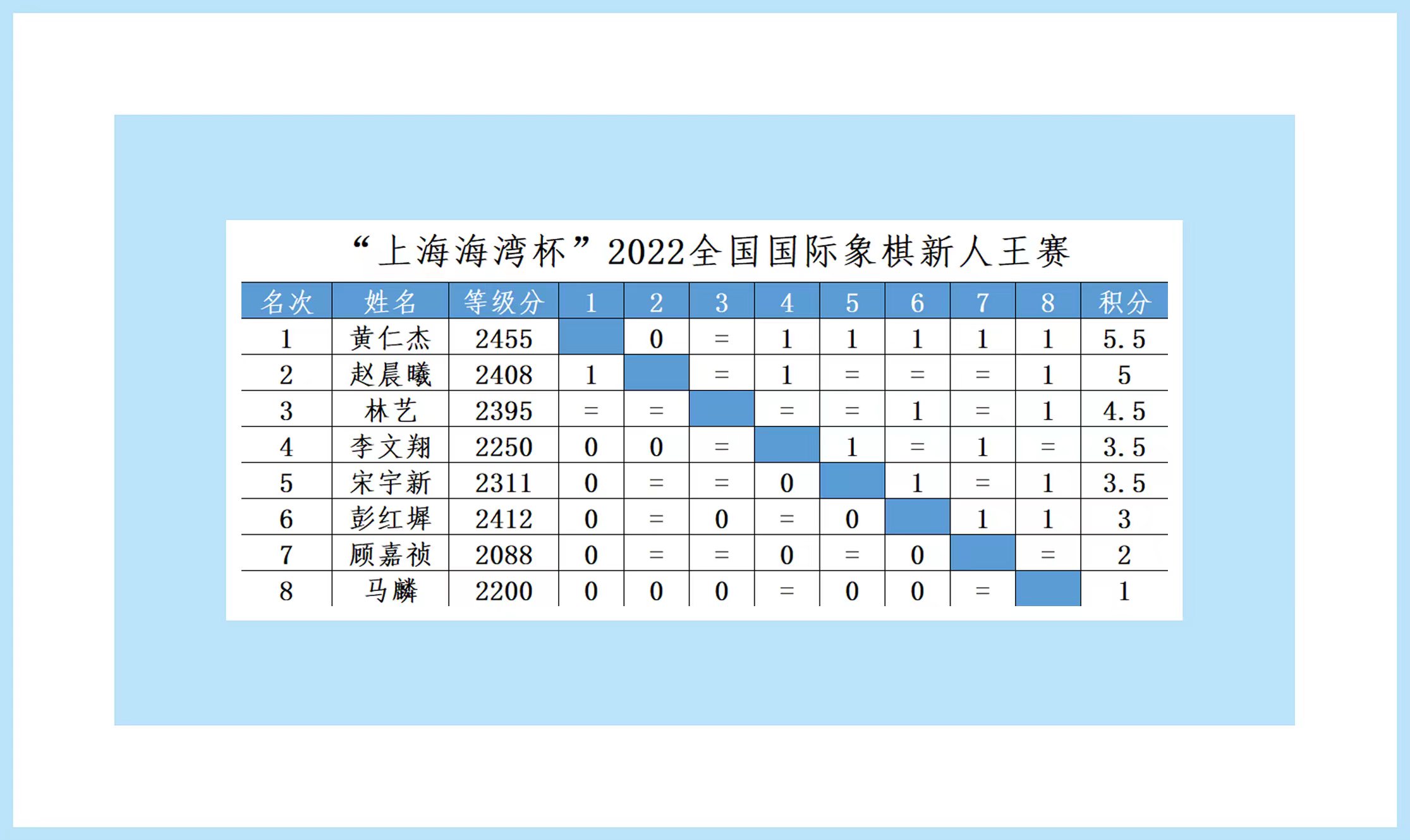 今年八位参赛棋手中,上届亚军赵晨曦以3胜4和积5分的不败战绩,再获亚军。第三次参赛的林艺以2胜5和积4.5分,获得第三名。李文翔和宋宇新同积3.5分。李文翔凭借直胜关系占优,获得第四;本次比赛唯一的女棋手宋宇新排名第五。彭红墀、顾嘉祯和马麟分别以3分、2分和1分,排名第6至8位。