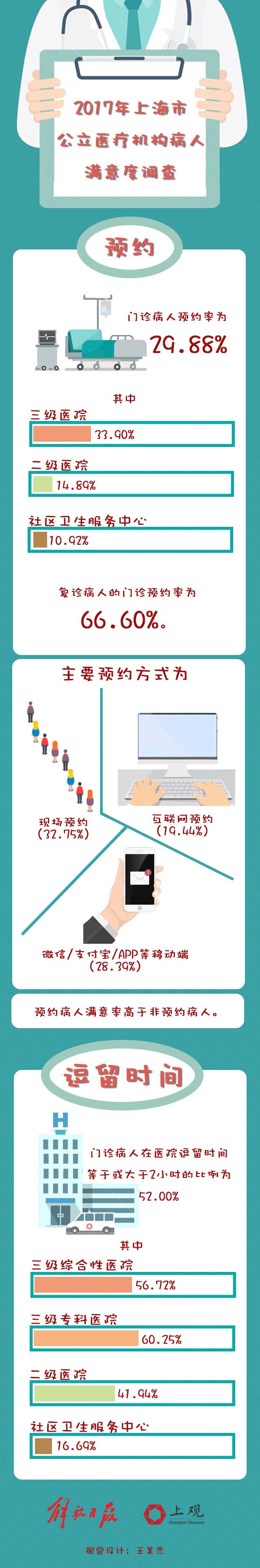 今天上午公布的“2017年上海市公立医疗机构病人满意度调查”显示:2017年上海市公立医疗机构被调查的门诊病人中,预约率为29.88%;三级医院的门诊预约率为33.90%,显著高于二级医院和社区卫生服务中心(分别为14.89%、10.92%);复诊病人的门诊预约率为66.60%。