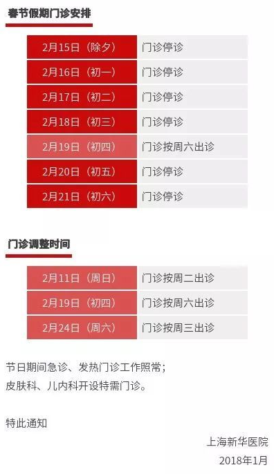 2 月 15 日(除夕)至 18 日(年初三)门诊停诊。
