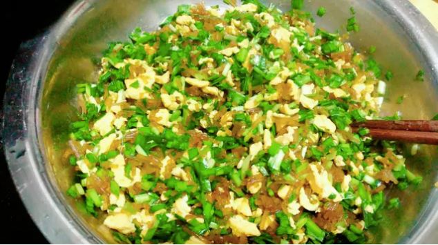 鸡蛋摊成蛋饼后,切碎;鲜虾仁烫熟,切成丁;粉条泡软后,处理成小段;这些食材和切成小段的韭菜,拌在一起。加少许花生油、盐、胡椒和味精轻轻拌匀。