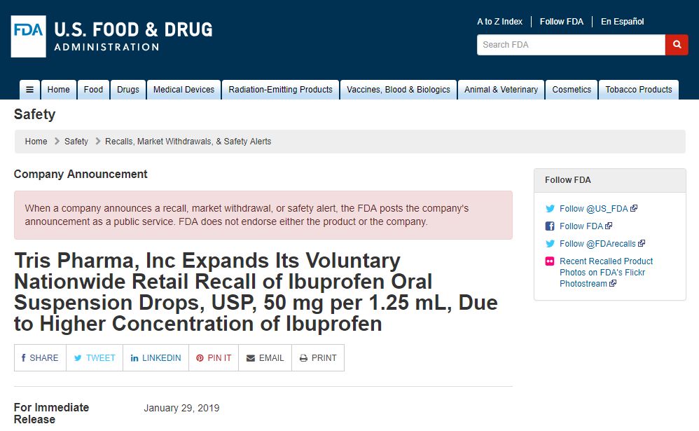 但从原文可以看出,其实是美国Tris制药公司的一款布洛芬口服混悬滴剂,由于部分批次可能含有较高浓度、超过规定标准10%的布洛芬,而做了全国范围的召回。
