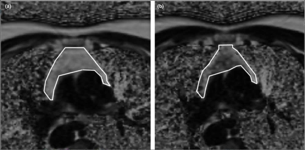 ▲白线表示胸腺边界,变暗对应于非脂肪组织代替脂肪