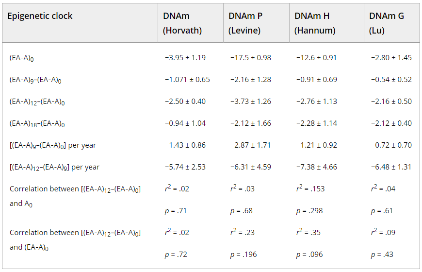 注意:EA =表观遗传年龄;A =实际年龄;0 =零个月(试验开始);9,12,18 =试验开始后9,12和18个月;所有结果均以年或年为单位给出。