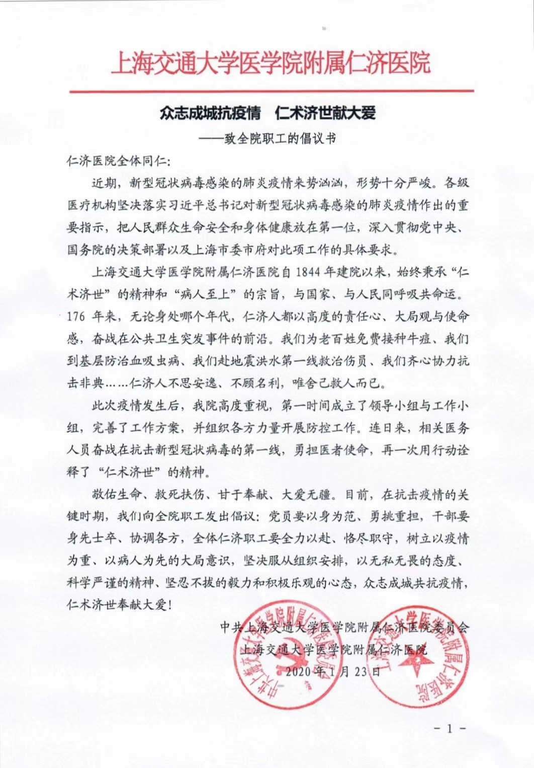 敬佑生命,救死扶伤,甘于奉献,大爱无疆!仁济医院,今天也发出了致全院职工倡议书。