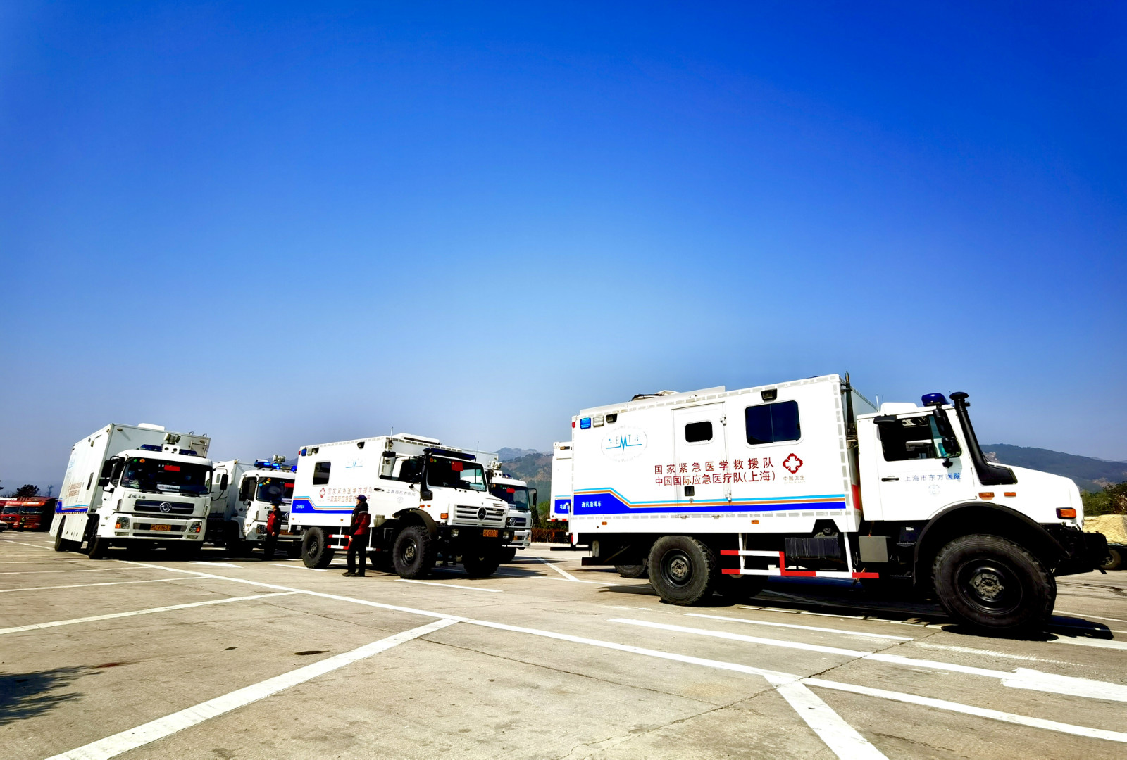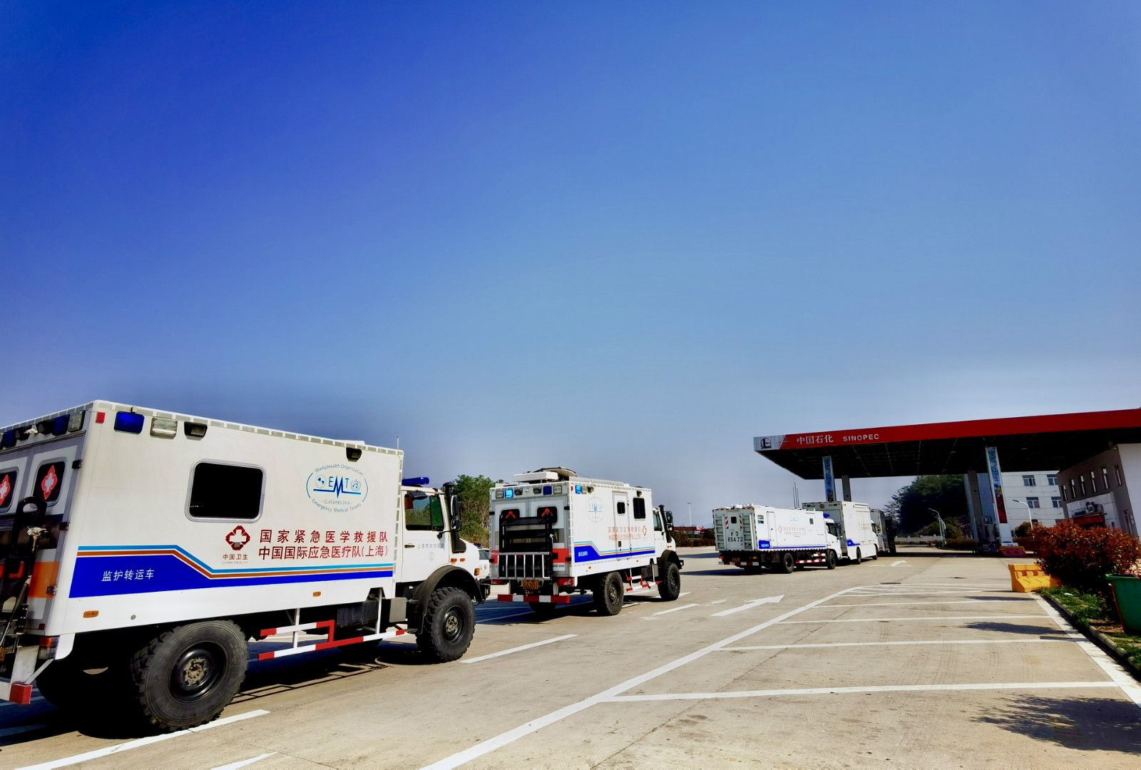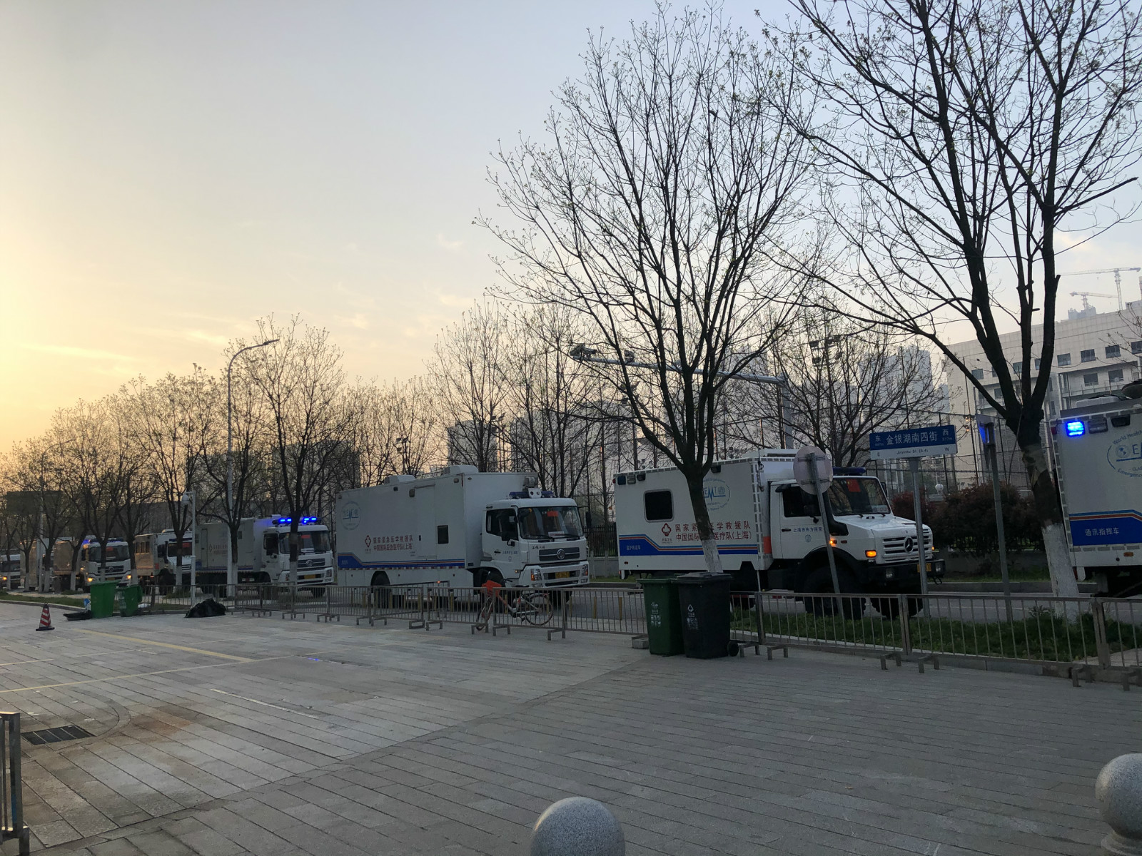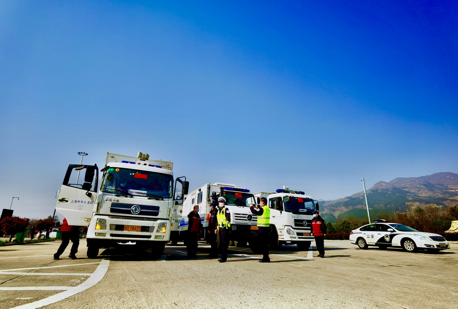 ▲今日中午,华山医院国家紧急医学救援队车队已抵达大场停车场。(袁婧摄)