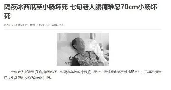 吃了隔夜冰西瓜2小时后,他突然腹痛难忍,送到医院后发现,近70㎝的小肠已经充血、水肿、坏死,最后被手术切除。
