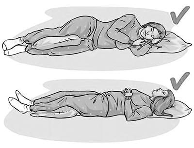 侧卧时枕头选择合适的高度使颈部不发生侧曲。双腿夹一个枕头,同时屈髋、屈膝130°左右,这样脊柱在同一个水平线上,肌肉可以充分得到放松;仰卧时膝关节下方,腘窝处垫一个枕头,头部枕头高低适中,颈部充分支撑。这样骨盆不会过度前倾,腰背部肌肉得以放松休息。