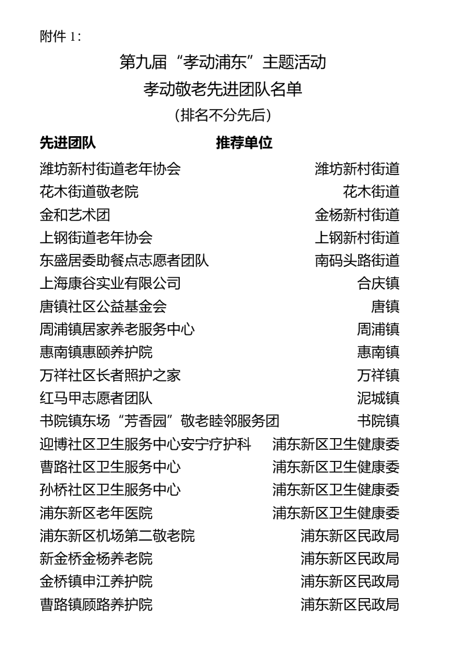 第九届“孝动浦东”主题活动孝动敬老先进团队名单