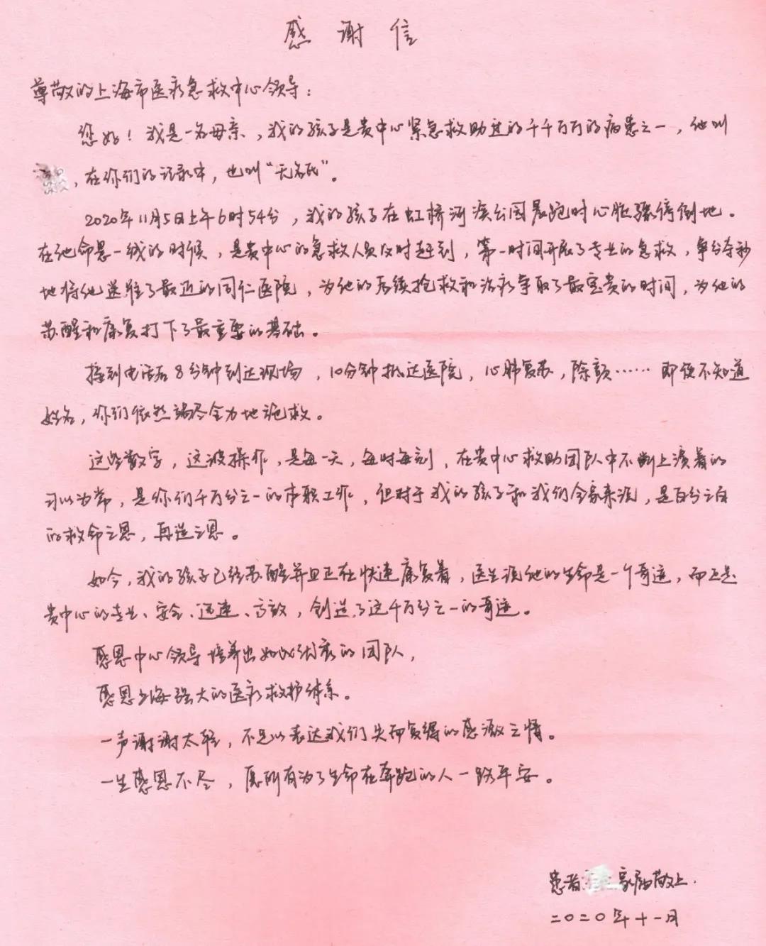 信里,母亲动情地诉说着他的儿子从晨跑时心脏骤停倒地到“120”及时救治,从现场心肺复苏成功到院内苏醒康复,没有华丽的辞藻,没有刻意的跌宕起伏,却看得令人感动。