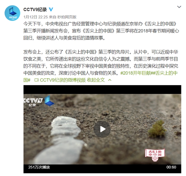 12日下午,中央电视台广告经营管理中心与纪录频道在京举办《舌尖上的中国》第三季开播新闻发布会,宣布《舌尖上的中国》第三季将在2018年春节期间暖心回归,继续讲述人与美食背后的温情故事。