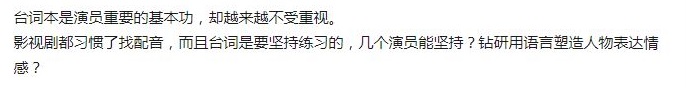 要知道,“声形台表”素来是表演艺术的“四字真经”,首当其冲就是“声”。声音对塑造角色起了非常大的作用。台词,是演员重要的基本功,却越来越不受重视。就像网友留言所说的那样——