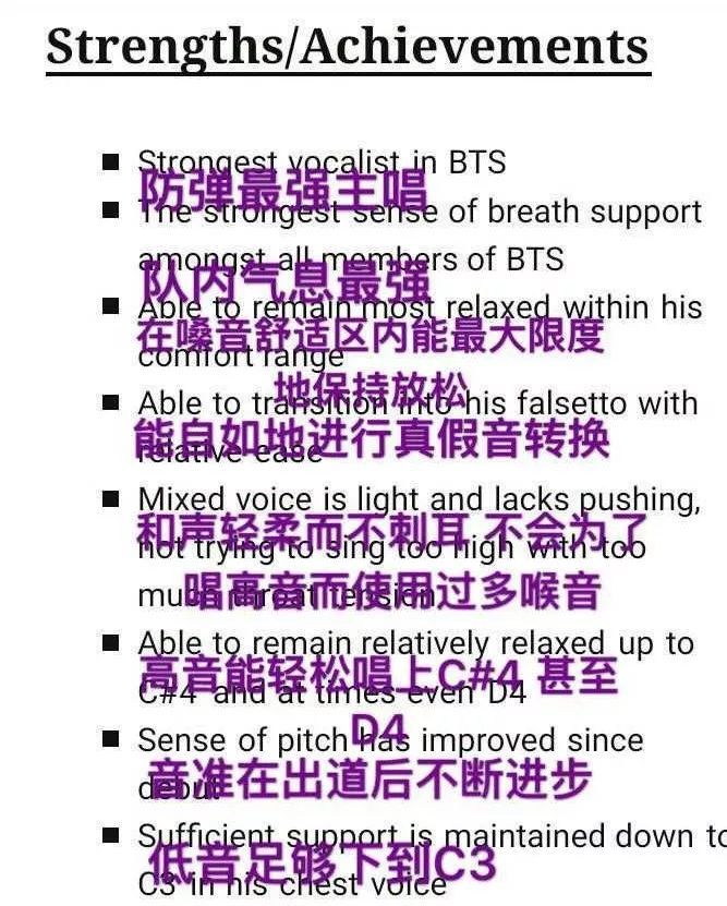 大红大紫的防弹少年团因为他们卓越的音乐表现把自己的名字传播到了世界各地! 而金泰亨作为队内的歌唱担当,一直被人津津乐道的歌唱实力更是组合的音乐磐石。防弹中唯一中低音vocal,不仅是在队内乃至韩圈也是少见的如此音色的vocal。 队内音域最广,在Stigma现场,甚至可以用头腔共鸣的发音方式达到G5,最高音能达到C6(没有几个kpop歌手能够轻松达到如此)。
