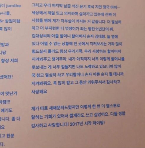 “金大成的儿子,爷爷奶奶的孙子金泰亨,处于不得已的情况只能在远处看着,不知道有多辛苦的我的家人们,要好好照顾我们亲爱的爷爷。 虽然如今还因为无法亲自送走奶奶感到辛苦,我也在努力着忍耐着,努力地成为奶奶漂亮的孙子,请大家拭目以待 。 受到很多的祝福,感谢那段时间的养育,我爱你们”。