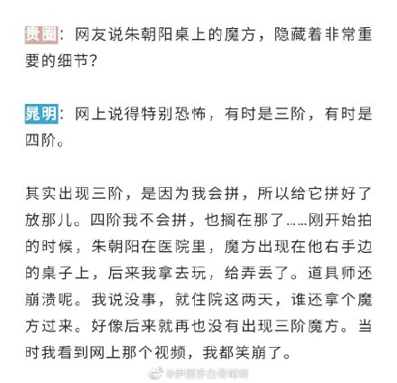 摄影指导主动“认错”:三阶的魔方我会拼,所以是拼好的;后来三阶的弄丢了,摆了四阶但是我不会拼了。