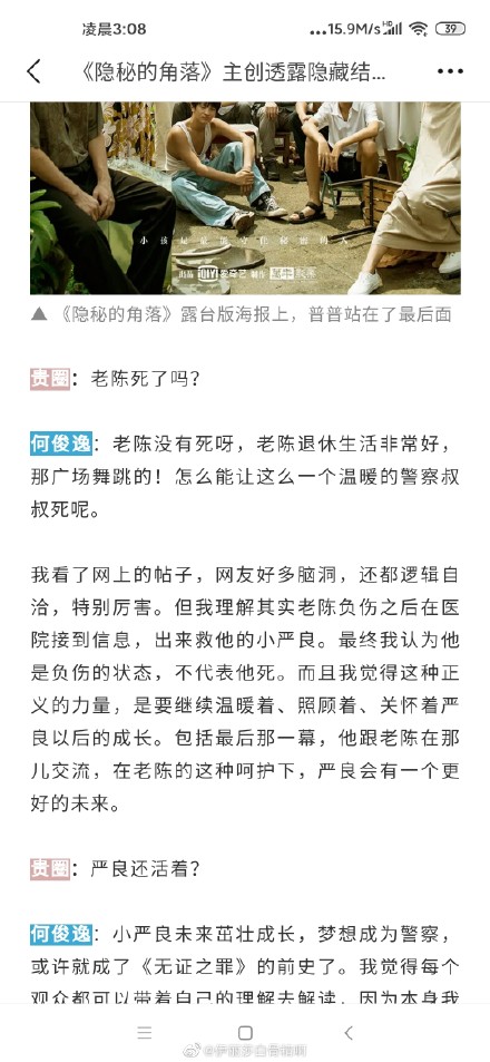 总制片人何俊逸澄清:没没没!老陈早就跳起广场舞啦!小严良也在他的庇护下茁壮成长!我们是一个温暖向善的剧,怎么允许那么多好人无辜惨死!