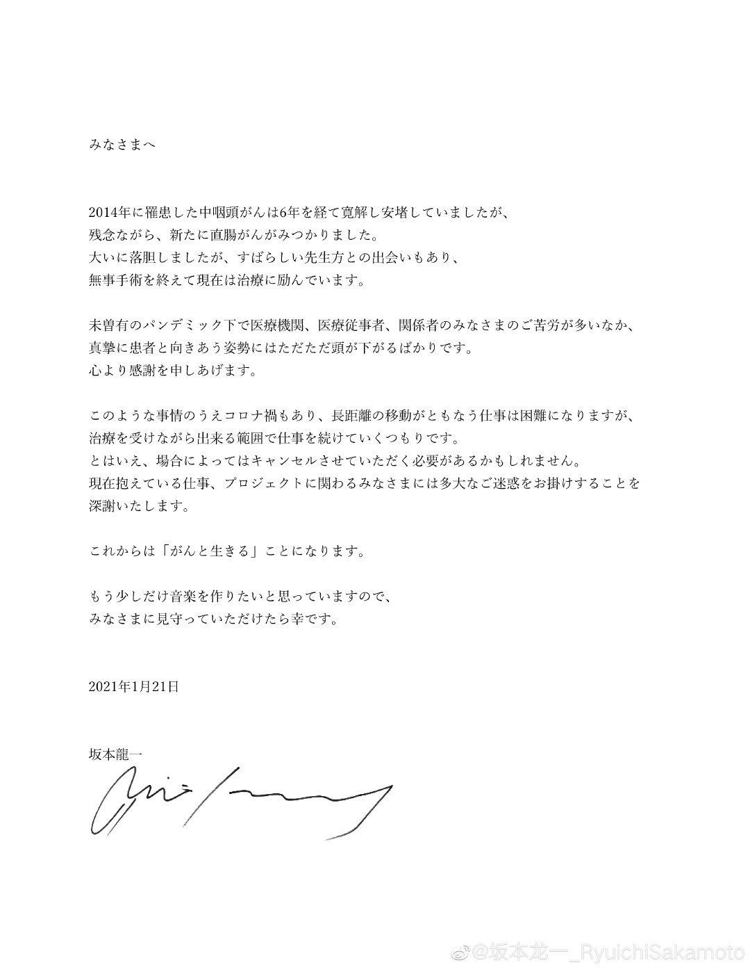 21日,坂本龙一在微博发文,称自己被确诊为直肠癌。