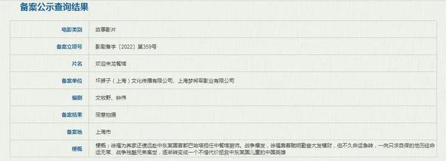 3月22日,国家电影局发布了2022年1月全国电影剧本(梗概)备案、立项公示,万玛才旦担任编剧的《雪豹》,文牧野、钟伟担任编剧的《欢迎来龙餐馆》,陈宇、张艺谋担任编剧的《满江红》,周运海、向尧惟、吴慧玲担任编剧的《一点就到家2》等影片正式立项。