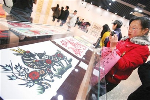 上图:现场展出的以羊为主题的剪纸艺术作品,意趣灵动。本报记者 叶辰亮摄
