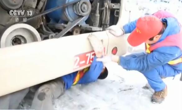 一张废旧硬纸壳往雪地里一摊,背对故障车辆一躺,双脚用力、身体一窜,几秒钟的功夫,抢修队员就已经钻到车底。