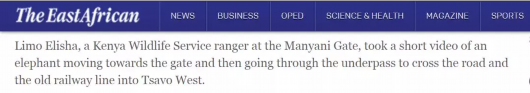 东非地区性报纸The EastAfrican在文章中提到,肯尼亚野生动物服务管理员Limo Elisha拍到了野生大象穿过动物通道到达西察沃的视频。