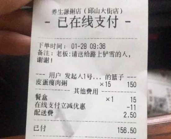 2018年1月29日,四川德阳,一名外卖小哥接到一份没有收货人、没有具体地址的外卖订单,“外卖小哥不用送,这么冷的天自己吃一份,剩下的送给环卫工或者有需要的人。送出去就行。谢谢!辛苦!”