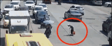 这时,一个小伙推着电动车毅然闯入车流