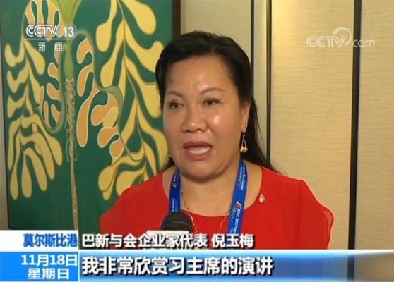 巴新与会企业家代表倪玉梅:“ 我非常欣赏习主席的演讲,他说我们要互帮互助,巴布亚新几内亚是一个非常小的国家,但是中国政府平等地看待我们,以朋友间的方式帮助我们,巴新正向中国学习提升每个人的生活质量 实现减贫。”