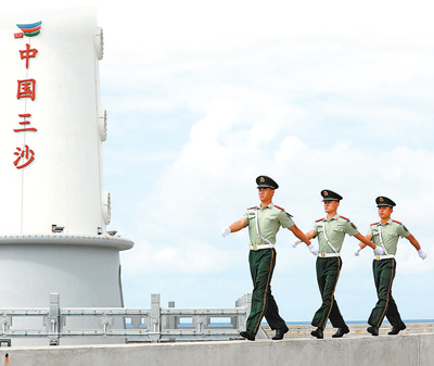 驻守三沙永兴岛的武警官兵在码头巡逻。 |