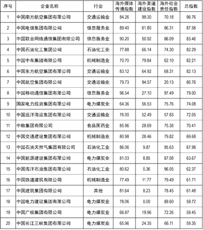 表1:2018年中央企业海外形象传播指数排行榜(总榜TOP20) |