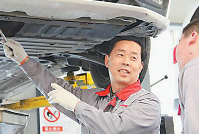 王兆才在向新员工讲解示范修车注意事项。 |