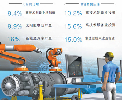 国家统计局最新数据,1—4月,全国发明专利申请量达到43.9万件。前5个月,高技术产业投资增长11.9%,其中,研发设计服务投资增长27.1%;制造业技术改造投资增长15%;新能源汽车、太阳能电池等新产品保持了两位数增长。