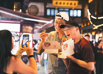 游客在上海豫园夜市开心地品尝当地特色小吃生煎包。 |