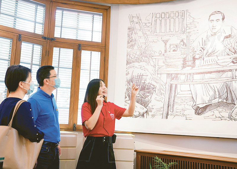 2018年5月,复旦大学将陈望道故居改造为《共产党宣言》展示馆,该校一批青年教师和学生组建党员志愿服务队,面向广大师生和社会各界开展宣讲活动。2020年6月,他们中的30名队员给习近平总书记写信,表达了做《共产党宣言》精神忠实传人的信心和决心。习近平总书记在回信中勉励他们继续讲好关于理想信念的故事,并对全国广大党员特别是青年党员提出殷切期望。图为党员志愿服务队队员在为观众讲解。 新华社记者 刘颖/摄