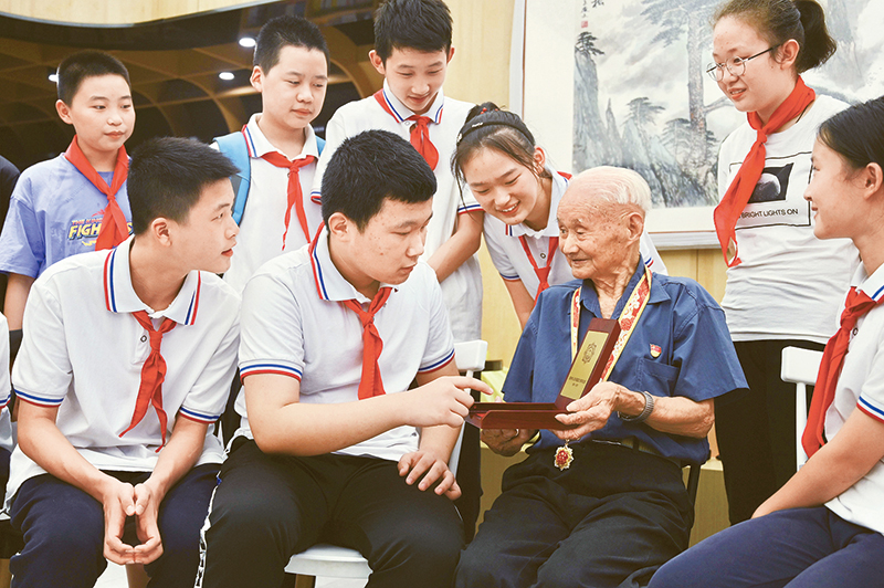 2020年8月23日,安徽省合肥市薛河湾社区举行“听老兵讲故事”爱国主义主题教育活动,少先队员们聆听老兵讲述抗战故事,铭记战争的苦难与胜利的光荣。图为学生们在听九旬老兵施长明讲自己当年的战斗故事。中新社记者 韩苏原/摄