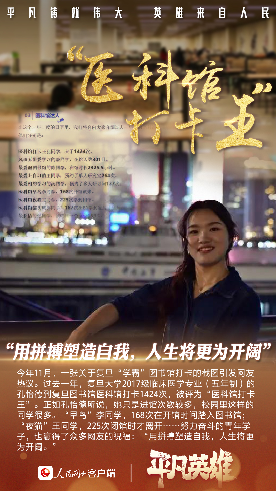 拼搏带来的感动总能直抵人心。绝壁凿出“天路”的当代“愚公”、“逆风翻盘”的无臂考生、一年打卡图书馆1424次的复旦学子……他们生而平凡,却各自有光。