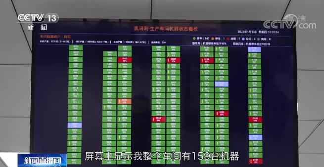 我现在越来越喜欢这份工作了,因为我们不只是单纯地看袜机。大家看一下我身后的三块大屏幕,中间的这一块是我现在工作的最主要的一大部分,屏幕上显示我整个车间有159台机器,然后上面会很明确地体现出来每一台机器生产的状态, 1、2、3,现在有三块红色的方块,代表三台机器是有故障的,通过大屏幕我们能够一目了然,如果换做以前的话,我们排查这样的故障可能需要半天以上的时间。