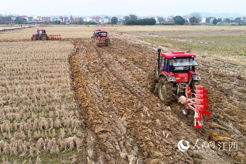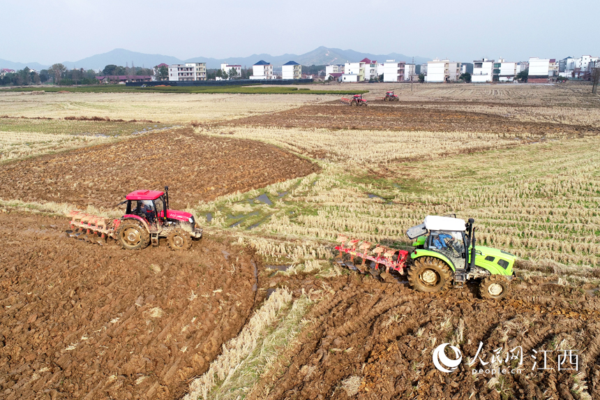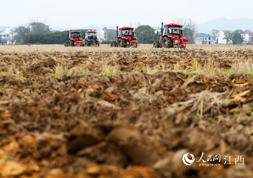 1月19日,江西省抚州市东乡区小璜镇小璜村的农田里,旋转犁正在对农田进行机械化作业。随着气温回升,江西省抚州市东乡区各地纷纷拉开春耕备耕序幕,田间地头呈现出一派忙碌景象。